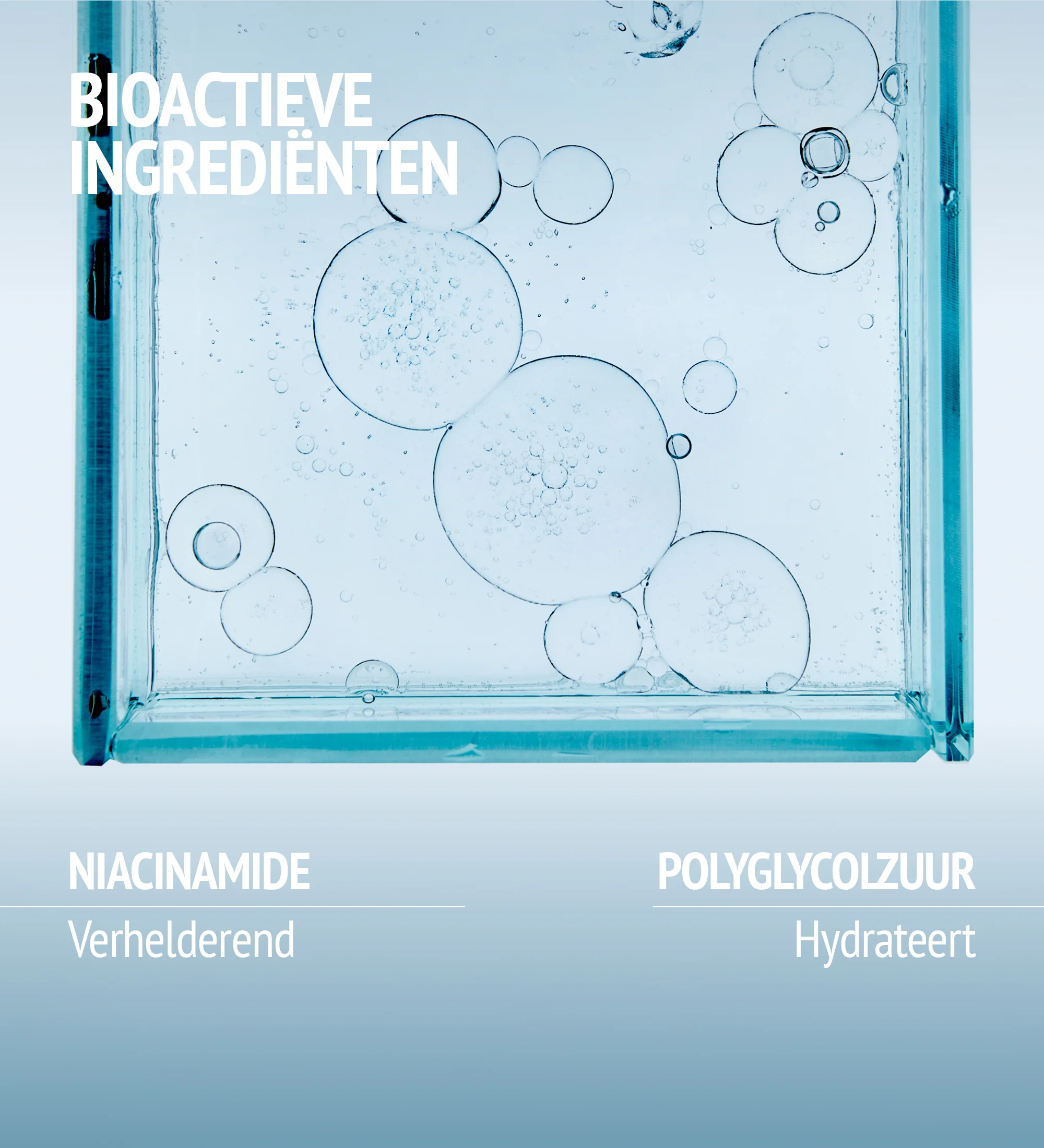 Intensieve cosmetische behandeling met een verhelderend complex (Niacinamide en NAG) en Polyglutaminezuur (PGA) met hydraterende werking voor een gezondere teint en een zachtere, gladdere huid.