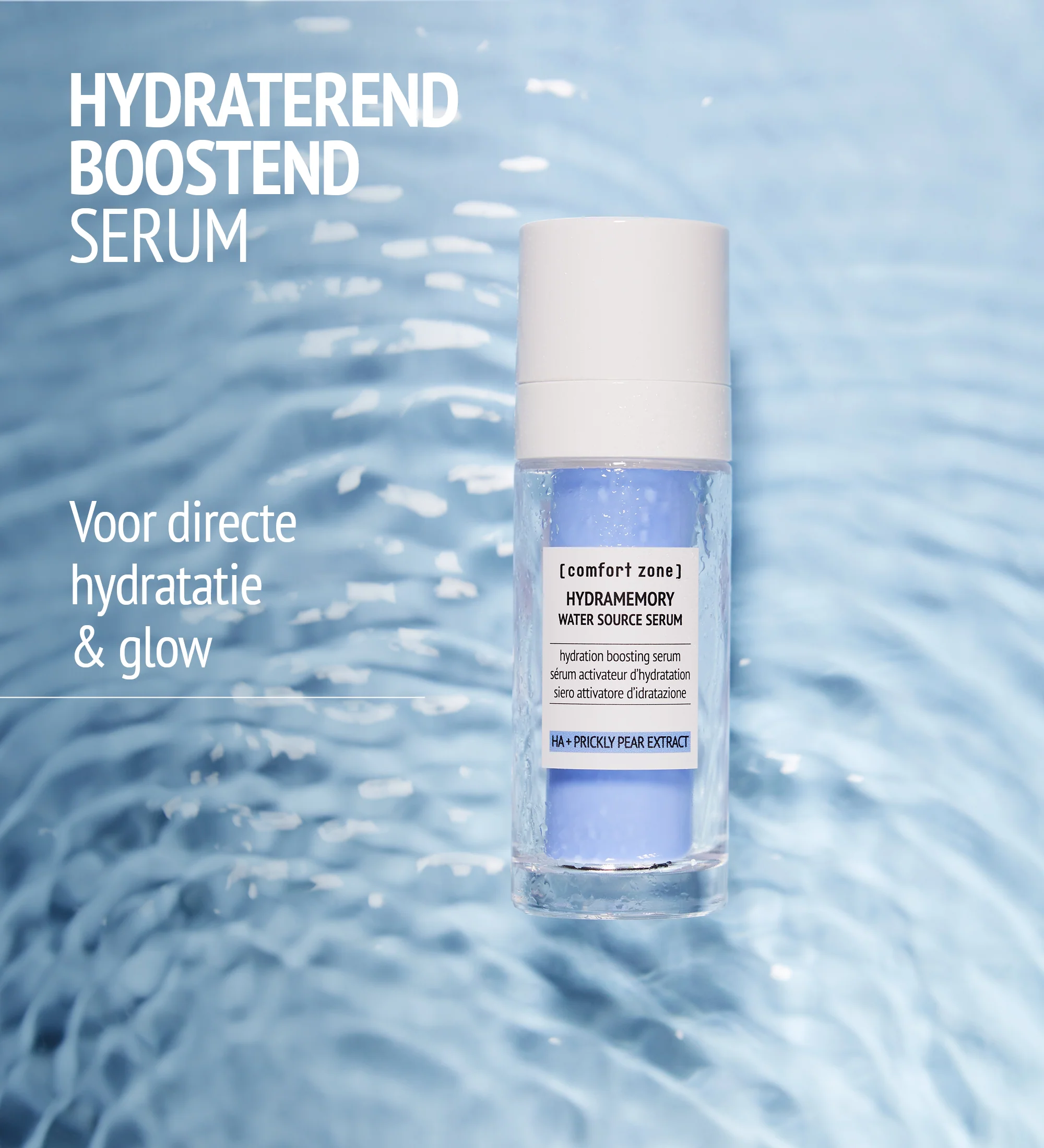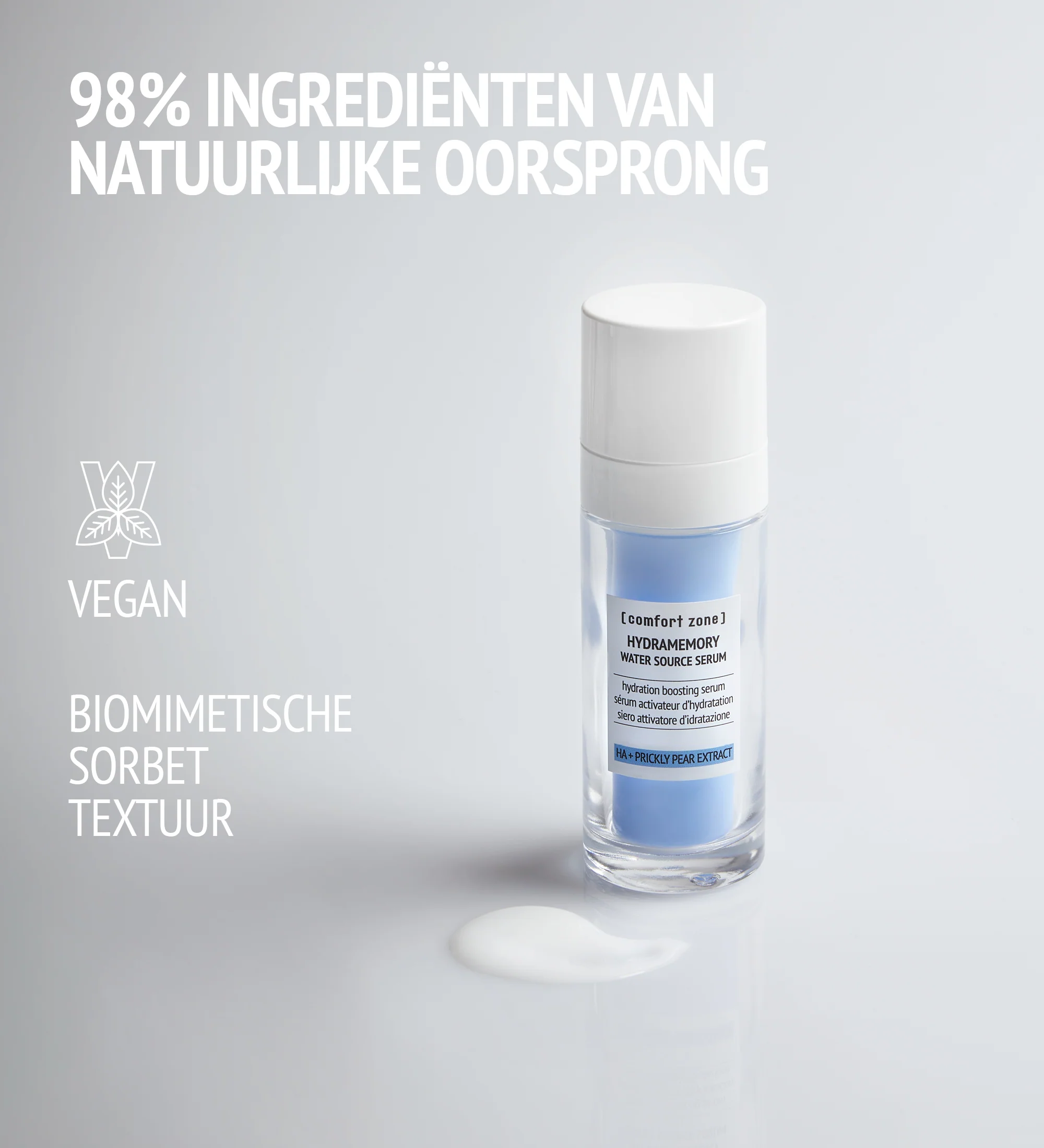 Een waterval van hydratatie in een flesje. Het nieuwe Hydramemory Water Source Serum is een fris en licht serum met een verkwikkende formule die zelfs de meest uitgedroogde en doffe huid hydrateert en doet stralen. De snel absorberende textuur maakt dit product de perfecte match om de doeltreffendheid van de Rich en Light Sorbet Creams te versterken. De veganistische formule is verrijkt met SKIN-ADAPTIVE HYDRATION technologie: Cactusvijgextract uit de biologische regeneratieve landbouw, Macro Hyaluronzuur* en de biomimetische textuur geven de huid direct zachtheid en stevigheid.