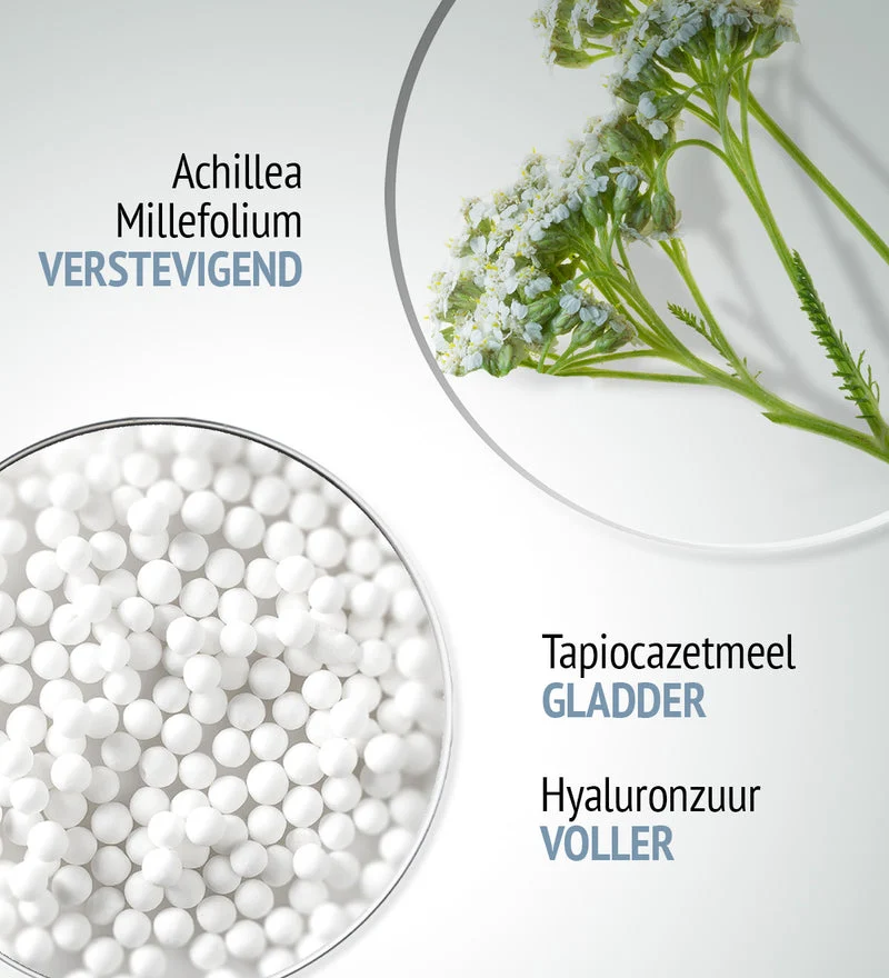 Intensieve cosmetische behandeling met anti-rimpel Peptide, Groeifactoren (EGF’s) en macro Hyaluronzuur. Het zorgt voor een verstevigend effect en minder zichtbare rimpels. De huid wordt onmiddellijk voller en gladder.