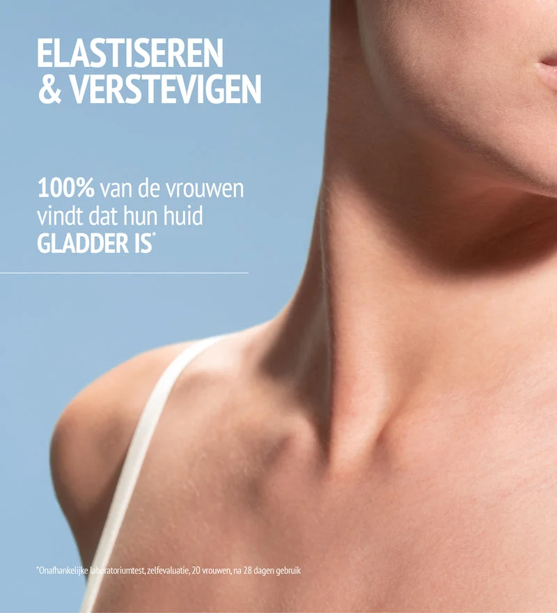 Klinisch bewezen* elastiserende en verstevigende werking Na 28 dagen vindt 100% van de vrouwen dat hun huid strakker en gladder is** Na 56 dagen is 95% van de vrouwen van mening dat rimpels en plooien zichtbaar zijn verminderd**
