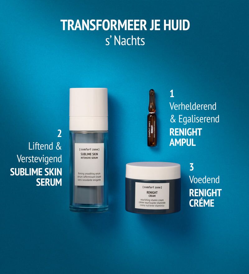 Ontdek het nieuwe krachtige vernieuwende concentraat van [ comfort zone ] om de huid en de oogcontour ’s nachts een zichtbaar gladdere en meer stralende uitstraling te geven. Met Retinale, Niacinamide en een Peptide van de nieuwste generatie, stimuleert deze formule de vernieuwing en helderheid van de huid om tekenen van ouderdom en vermoeidheid, zoals rimpels, kraaienpootjes en wallen, tegen te gaan.