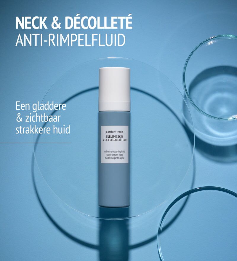 Nieuwe fluid Sublime Skin Neck&Dècolleté crème ontwikkeld in het [ comfort zone ] wetenschappelijk laboratorium. Deze rimpel gladstrijkende fluid heeft een lichtgewicht, snel absorberende formule die onmiddellijk micro- en horizontale rimpels corrigeert. De huid is zichtbaar verstevigd en stevig. Speciaal ontwikkeld voor de tere hals en het decolleté, verrijkt met krachtige bioactieve ingrediënten, zoals jojobazaadextract en anti-aging Achillea Millefolium-extract uit de regeneratieve landbouw.